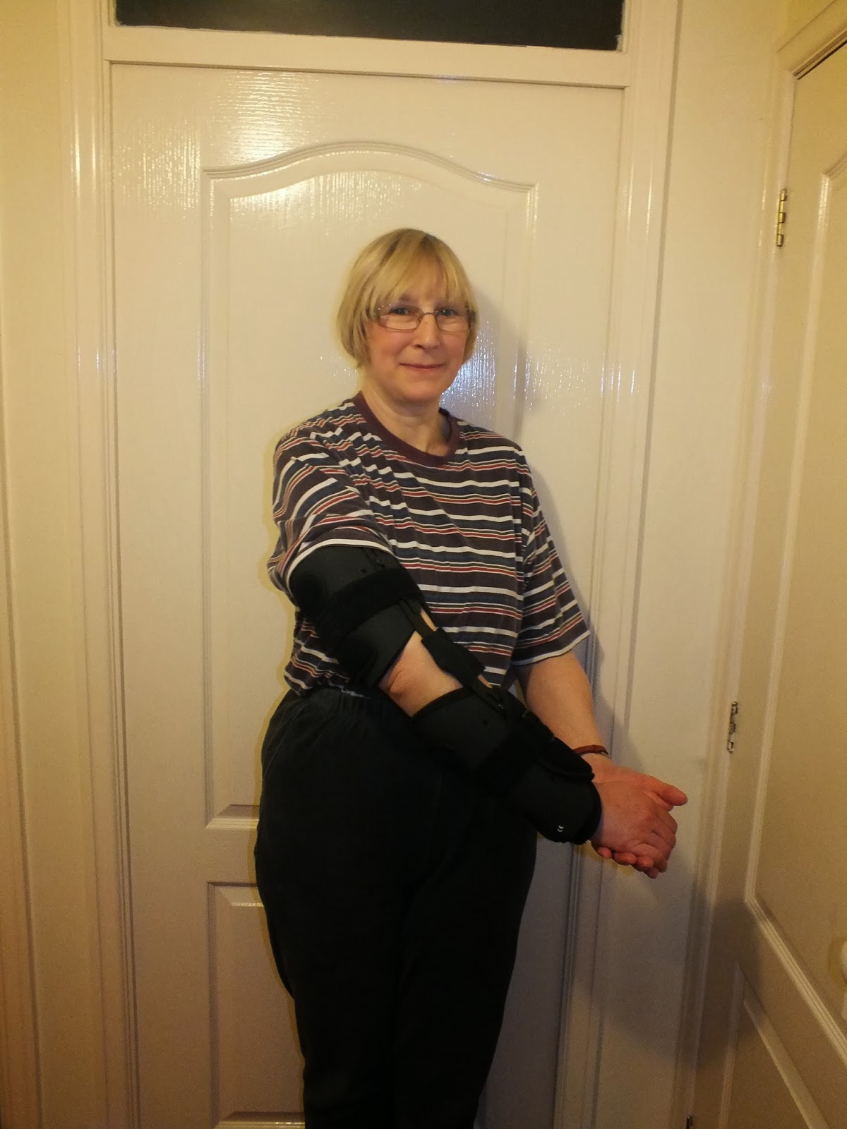 yes, you’ve guessed it, I’d broken my arm and my right (write) one at that! Not the greatest thing for a writer who now finds that she has to type left-handed with a one finger jobbie. No, not exactly a speedy way for a novelist to proceed, it’s hard enough just answering emails! But after two and a half weeks (broken 20th) I have made some progress and have now advanced to this brace: