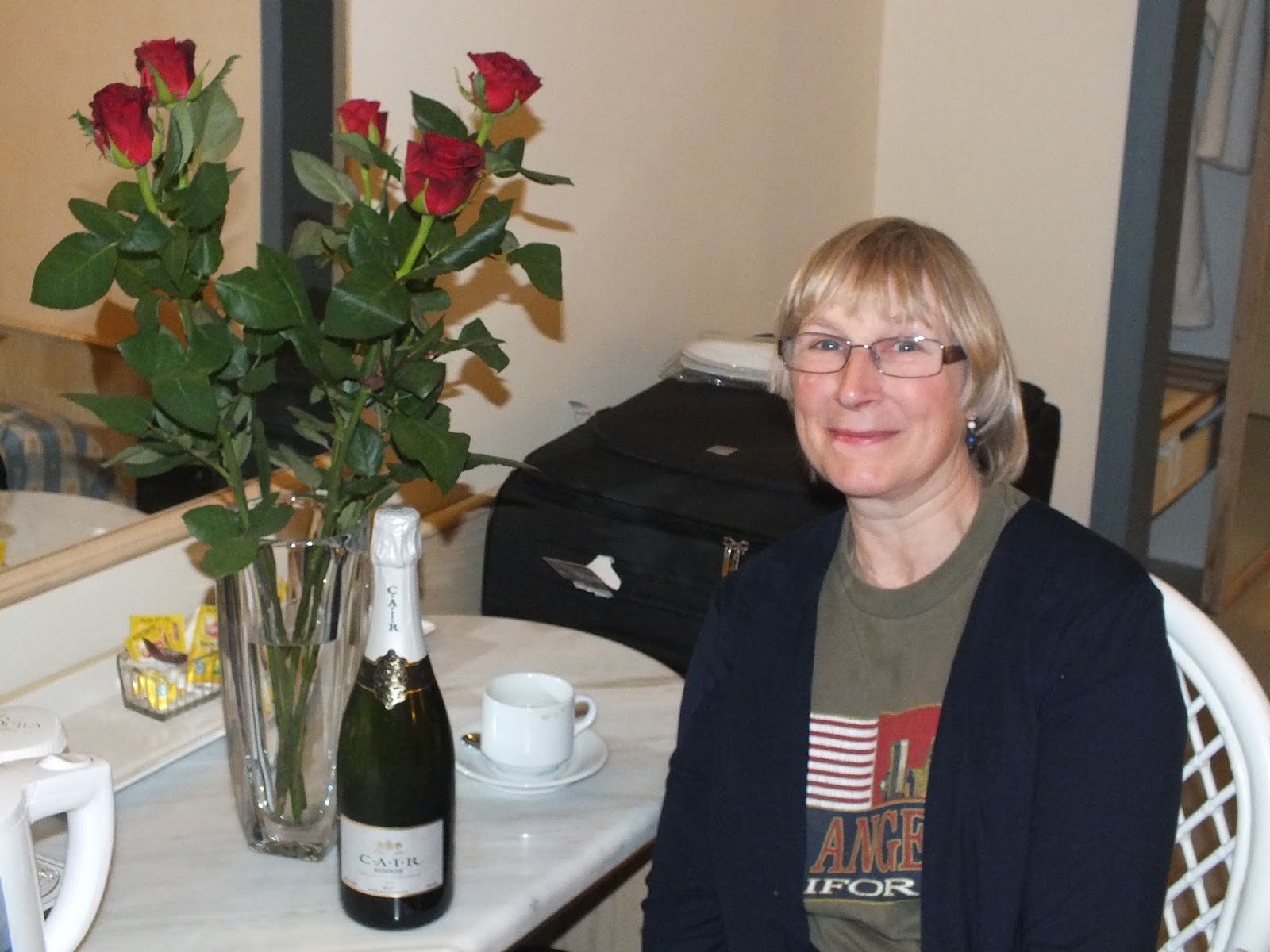 Not only the vase of roses and  bottle of champagne pictured but also a bowl of fresh fruit, sweets and a bottle of wine. We’d probably consumed most of them by the time we took this picture.