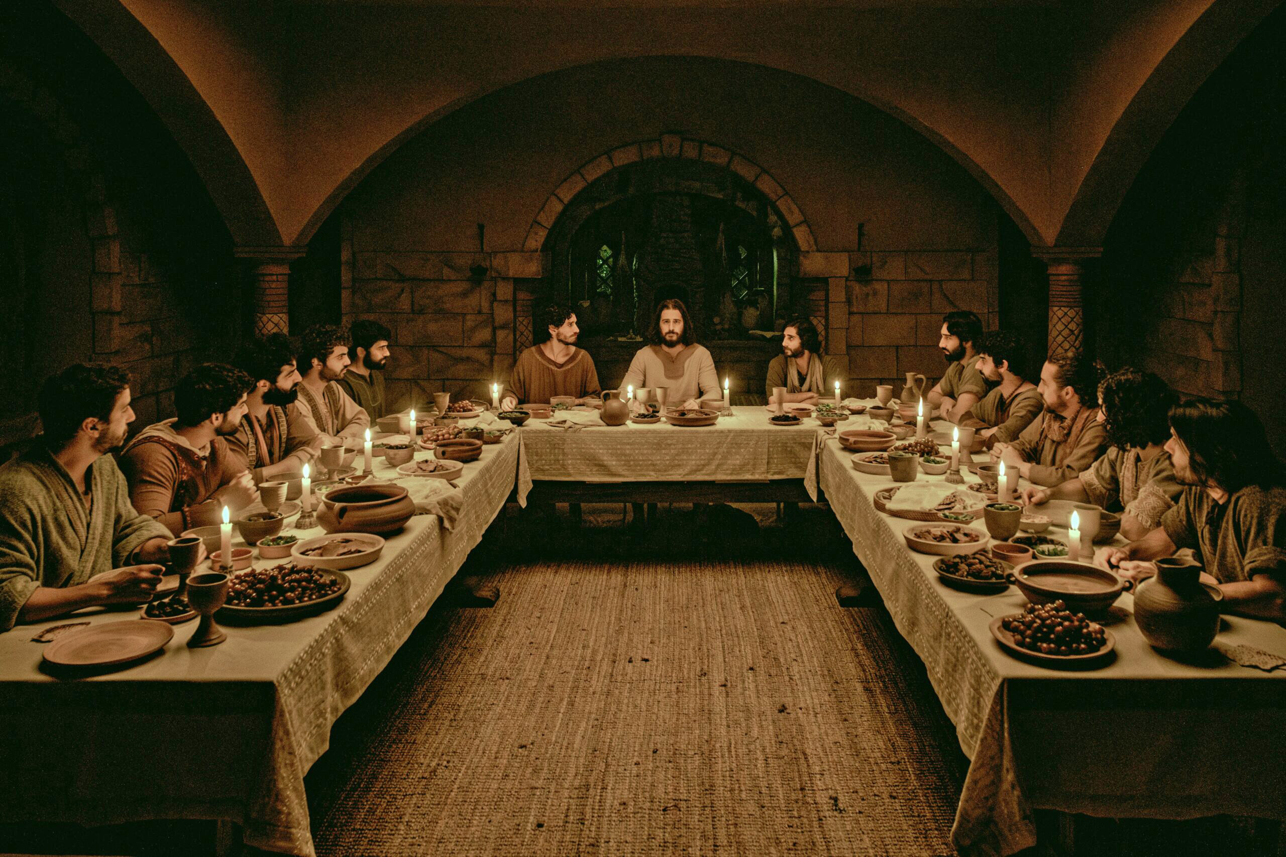 Jonathan Roumie, center, who plays Christ in the series “The Chosen,” is pictured in a scene from Season 5 depicting the Last Supper. Beginning March 27, the new season of the hit series, which focuses on the life of Jesus and his closest disciples, will hit theaters in the weeks leading up to Easter, which is April 20. The season will debut later in 2025 on streaming services. (OSV News photo/The Chosen)